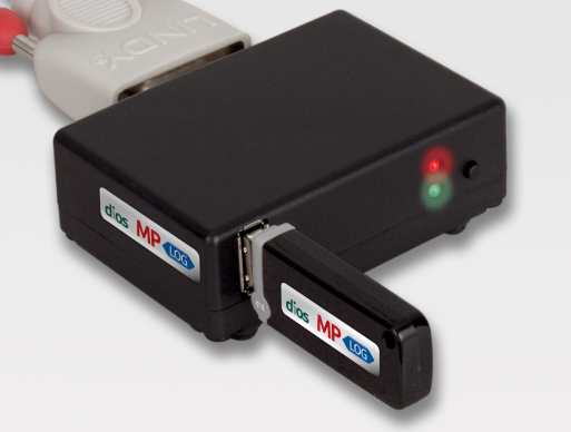 The USB flash drive can be inserted into the USB socket on the front side of the diosLOG Box as soon as the green LED is lighted. Ensure the flash drive is correct positioned. In the case of a correct position, the stickers of databox and flash drive are on the same side.
